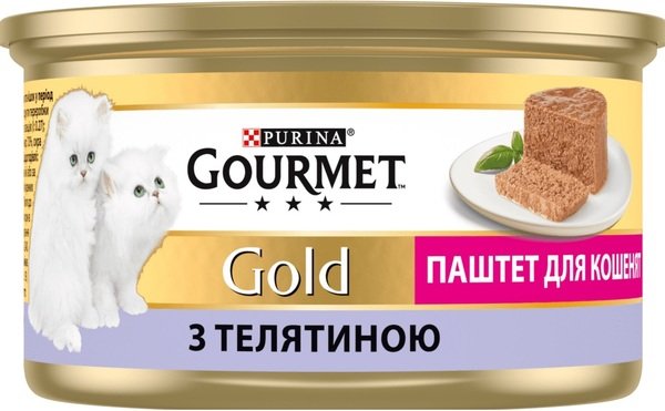 Паштет з ніжної ретельно підготованої телятини, збагачений вітамінами (А, С, D3 та Е) та мінералами (Fe, I, Cu, Mn, Zn) подбає, щоб всі харчові потреби кошенятка були задоволені й воно зростало здоровим. Паштет GOURMET Gold для Кошенят - апетитний рецепт, що дозволить кошенятам розділити найприємніші моменти дня зі своїм господарем.