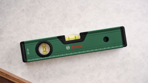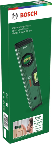 З рівнем Bosch полиці та картини будуть висіти рівно за лічені секунди. Завдяки своїй компактності він ідеально підійде для використання в умовах обмеженого простору. Рівень оснащений метричною шкалою від 0 до 22 см, що дозволяє використовувати його як лінійку для вимірювання та розмітки. Рівень виготовлений з міцного та легкого алюмінію, має посилені ребра та захисні наконечники з м'якими накладками, що забезпечує його довговічність та захист від пошкоджень.