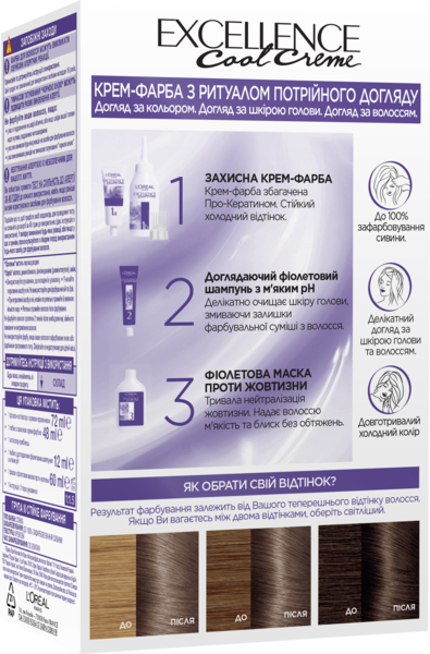 Стійка крем-фарба Excellence Cool Creme з потрійним доглядом, одночасно піклується про колір, шкіру голови і волосся, ідеально підійде для зафарбовування сивини.