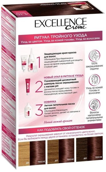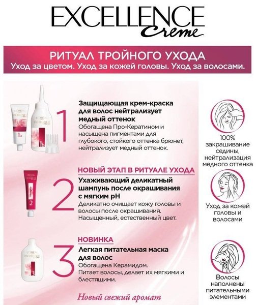 Excellence від L'Oréal Paris – крем-фарба з потрійним доглядом для волосся, яка захищає під час фарбування. 100% зафарбовування сивини. Будь-який відтінок волосся, будь-коли, без тіні занепокоєння.
