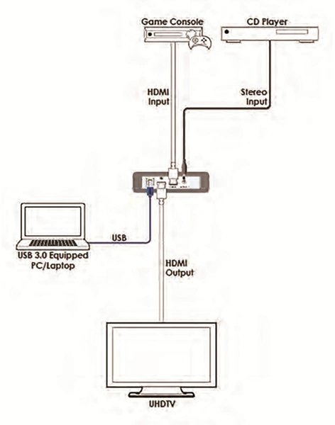 Цей пристрій відеозахоплення HDMI на USB з HDMI bypass підтримує роздільну здатність до 18 Гбіт/с (600 МГц) 4K UHD з HDR, одночасно передаючи аудіо- та відеосигнал з роздільною здатністю 1080p на комп'ютер, підключений до USB, для запису або ретрансляції. HDMI-джерела з роздільною здатністю до 1080p60 підтримуються для захоплення без змін, тоді як 4K-джерела будуть автоматично масштабовані до 1080p. Використання спеціальної функції стабілізації синхронізації відео допомагає гарантувати, що потік захоплення з USB не буде блокуватися або падати, навіть якщо джерело вхідного сигналу HDMI працює з перебоями або відключається. Цифровий стереозвук з HDMI (LPCM 2.0) або 3,5-мм аналогового аудіовходу буде захоплюватися за допомогою джерела відеосигналу HDMI, яке можна вибрати за допомогою конфігураційного програмного забезпечення. Захоплення через USB здійснюється з використанням стандартів UAC (USB Audio Class) і UVC (USB Video Class), що дозволяє пристрою підтримувати більшість поширених програм для захоплення відео, чату або потокового передавання. Пристрій живиться безпосередньо від порту USB 3.0, тому зовнішнє джерело живлення не потрібне (при підключенні через USB 2.0 потрібен Y-кабель для забезпечення необхідної потужності). Наявність і доступ до керованих функцій пристрою залежать від використовуваного програмного забезпечення для захоплення.
