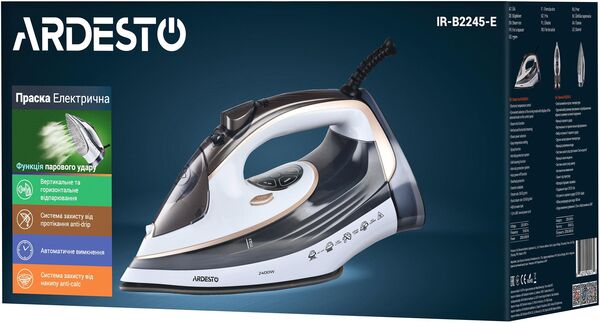 Модель IR-B2245-E оснащена збільшеним резервуаром для води об'ємом 400 мл та ергономічною кришкою для максимальної зручності наповнення. Передбачено систему від протікання «антикапля». Стійка до пошкоджень керамічна підошва з перфорованими 86 отворами рівномірно нагрівається і плавно ковзає в будь-якому напрямку. У прасці реалізовано електронний контроль температури та можливість вертикального та горизонтального відпарювання. Завдяки захисту від кальцинації буде збережено високу ефективність відпарювання та надійну роботу праски на довгі роки.