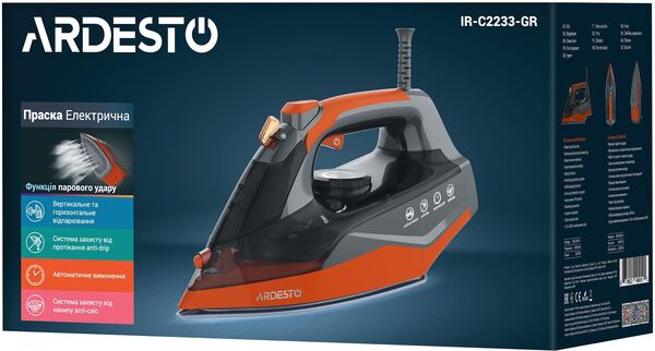 Модель IR-C2233-GR оснащена збільшеним резервуаром для води об'ємом 340 мл і ергономічною кришкою для максимальної зручності наповнення. Передбачена система від протікання "протикрапля". Стійка до пошкоджень керамічна підошва з 86 перфорованими отворами рівномірно нагрівається і плавно ковзає в будь-якому напрямку. Завдяки захисту від кальцинації буде збережена висока ефективність відпарювання і надійна робота праски на довгі роки.