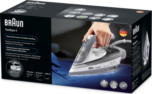 Створено для зручного прасування без зусиль. TexStyle 5 поєднує в собі відмінну продуктивність і унікальну ергономічну відкриту ручку, що забезпечує максимальну свободу рухів для більш приємного прасування. Тепер він також оснащений першою у світі технологією FreeGlide 3D - визнаним стандартом Braun.