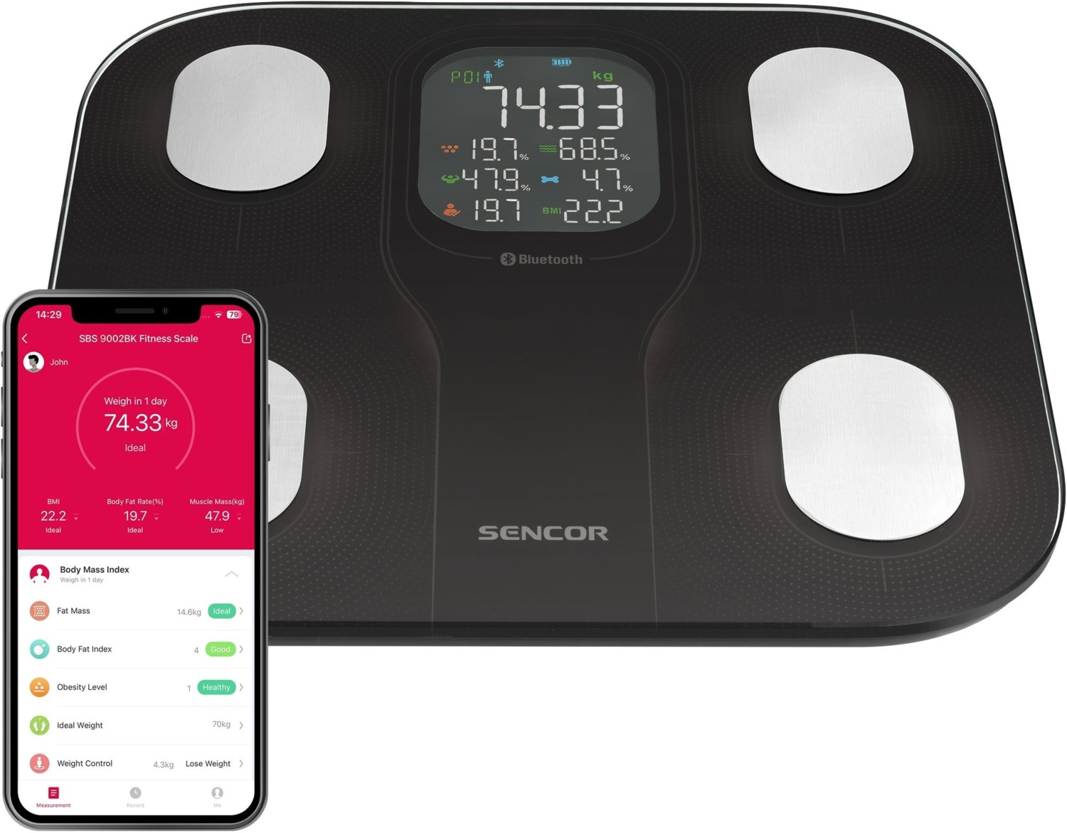 Bluetooth-з'єднання з додатком Sencor Home для iOS/Android, синхронізація з Apple Health, Google Fit, Fitbit, Strava. Профілі для кількох користувачів, історія вимірювань, аналіз (ІМТ, % жиру, % води, % м’язів, % кісток). Розрахунок щоденного споживання калорій. Живлення від 4 батарейок AAA 1.5 В (в комплекті).