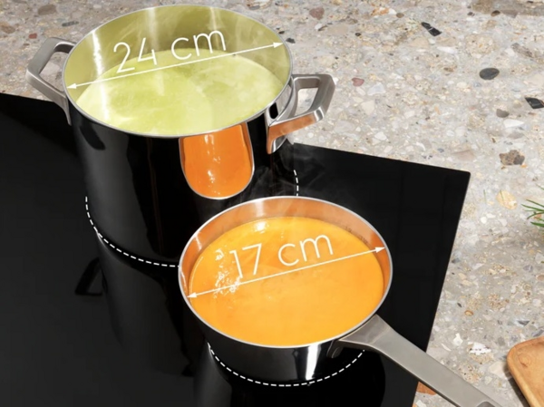 TotalFlex автоматично визначає каструлі та сковорідки різних розмірів і форм і створює зону приготування під ними, даючи змогу розміщувати та пересувати їх скляною поверхнею варильної панелі.