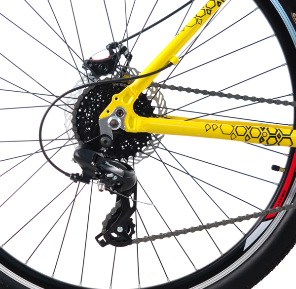 Середній розмір коліс робить велосипед універсальним: вони досить великі для плавного ходу і стійкості, але при цьому зберігають маневреність на складних трасах. Надійна трансмісія з 24 швидкостями дає змогу легко впоратися як з крутими підйомами, так і зі швидкими спусками. Перемикання передач здійснюється плавно, що робить поїздки комфортними в будь-яких умовах. Передні та задні дискові гальма забезпечують високу ефективність і безпеку, незалежно від погодних умов або типу дороги.