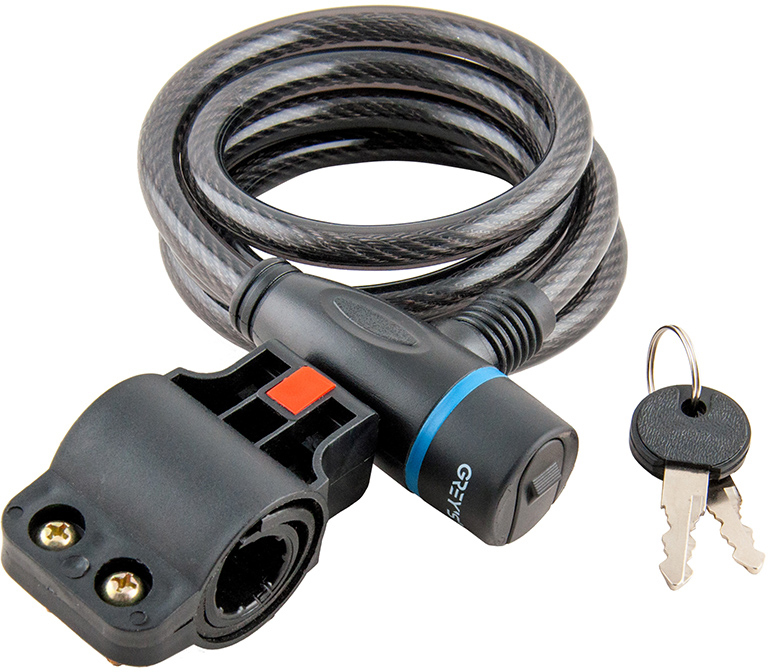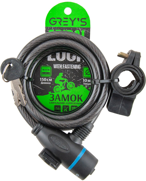 Замок Grey's спіральний із кріпленням 10 х 1500 мм. У комплект до замка 2 ключі й кріплення для транспортування на підсідельному штирі.