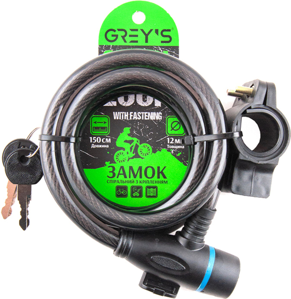 Замок Grey's спіральний із кріпленням 12 х 1500 мм. У комплект до замка 2 ключі й кріплення для транспортування на підсідельному штирі.