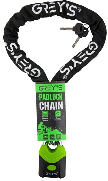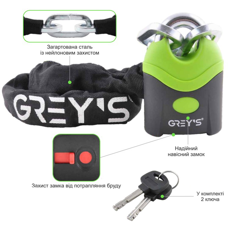 Надійний ланцюговий велозамок Grey’s 8×1000 мм з загартованої сталі забезпечує базовий захист велосипеда під час коротких та середніх зупинок. Має ключовий механізм замикання та захисне покриття, що оберігає раму від подряпин. Довжина 1000 мм дозволяє зручно обмотати замок навколо рами та колеса.