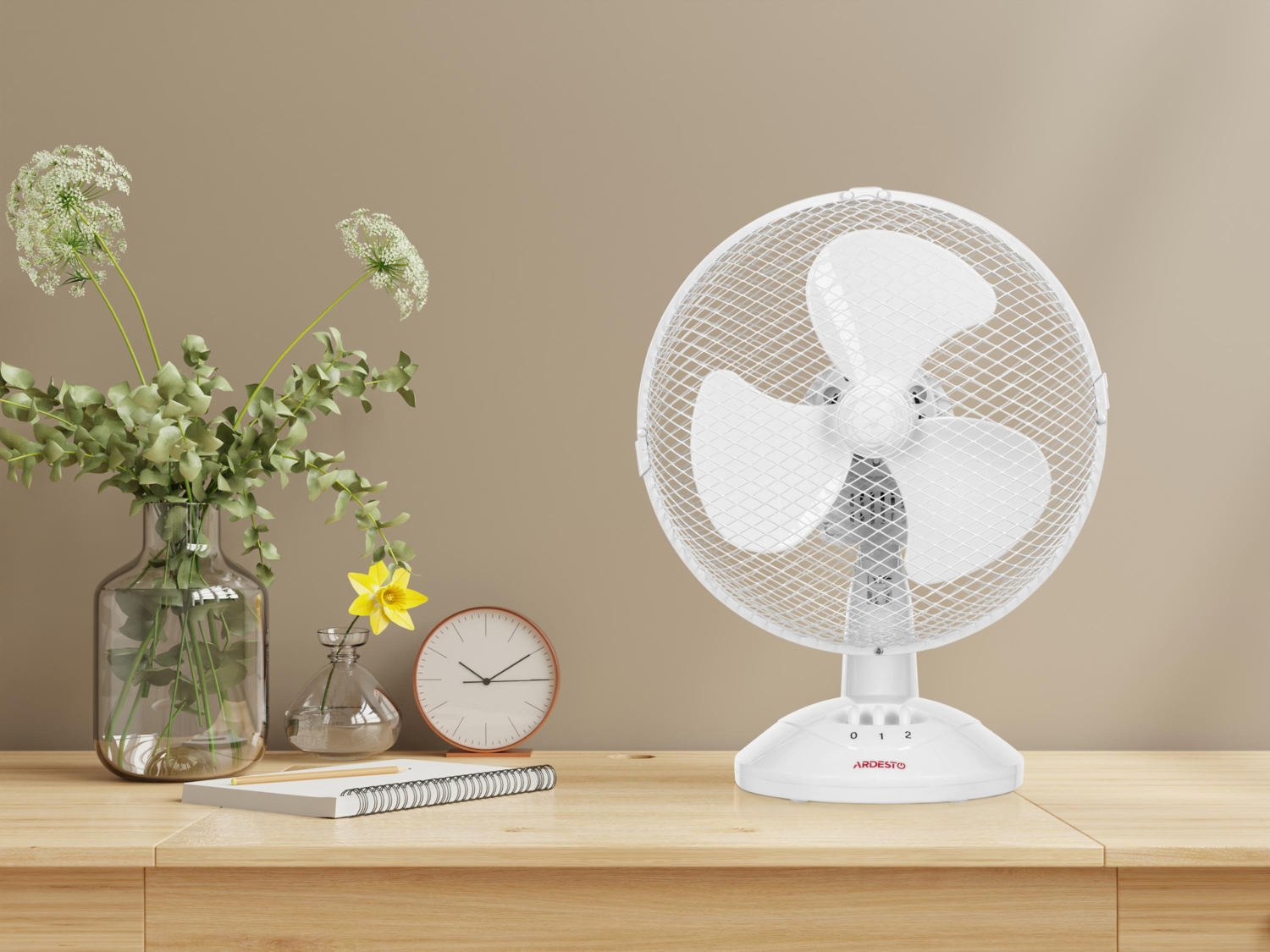 Настільний вентилятор Ardesto білого кольору на круглій опорі підійде до будь-якого інтер'єру. Потужність вентилятора становить 30 Вт, а рівень шуму – 60 дБ. Управління механічне – за допомогою двох клавіш перемикання швидкості. Діаметр лопатей – 23 см. Для безпеки використання вентилятор має захисну решітку посиленої конструкції. Також передбачений захист від перегріву двигуна. Кут нахилу вентилятора можна регулювати. Вага пристрою – 1,18 кг.