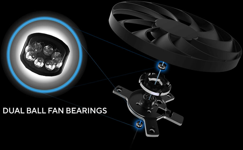 Вентилятори Axial-tech стали більшими і кращими. Вони працюють на довговічних подвійних кулькових підшипниках і переміщують на 21% більше повітря в порівнянні зі своїми попередниками. Шуму – менше, а температура – нижча, що означає підвищену продуктивність всього пристрою.