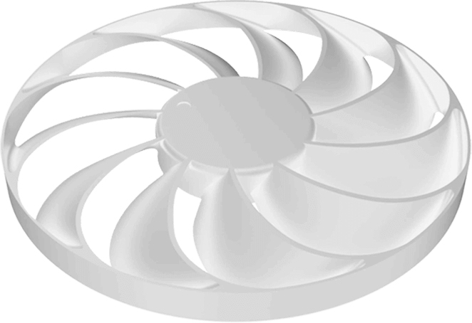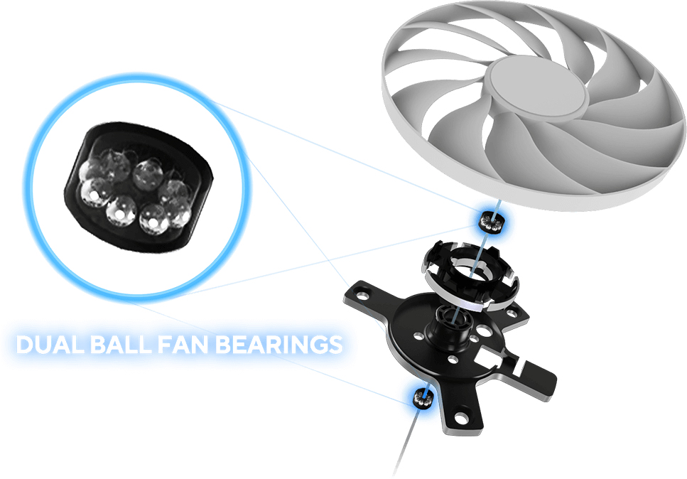 Три перевірені вентилятори Axial-tech мають зменшену втулку, що дозволяє використовувати довші лопаті, та обмежувальне кільце, яке збільшує тиск повітря на вході для зниження температури, зменшення рівня шуму та підвищення продуктивності.