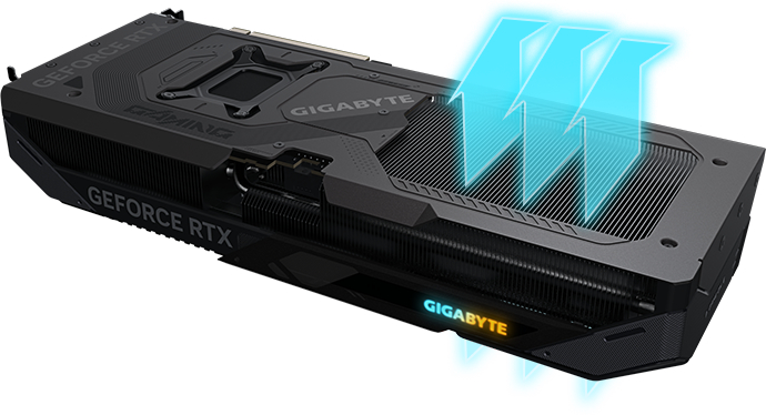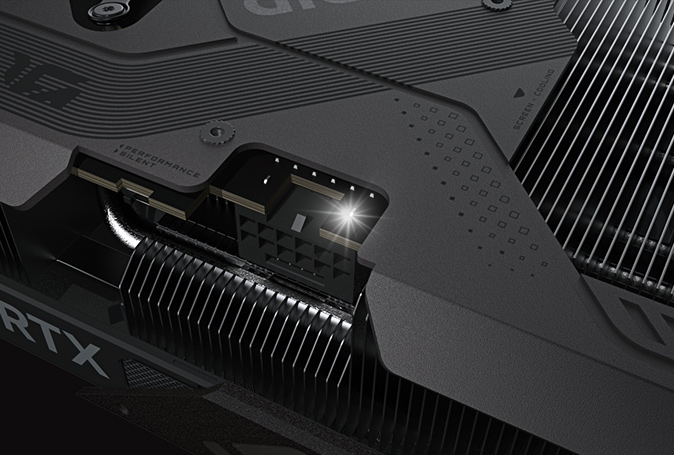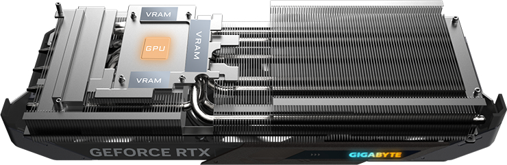 Велика мідна пластина безпосередньо стикається з графічним процесором і в поєднанні з композитними мідними тепловими трубками швидко відводить тепло від графічного процесора і відеопам'яті до радіатора.