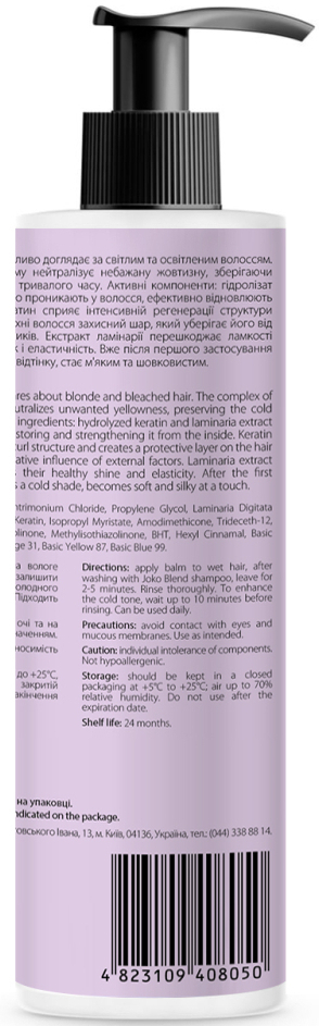 Тональний бальзам Joko Blend дбайливо доглядає за світлим та освітленим волоссям. Комплекс пігментів у складі бальзаму нейтралізує небажаний жовтий відтінок, зберігаючи холодний відтінок локонів протягом тривалого часу.
