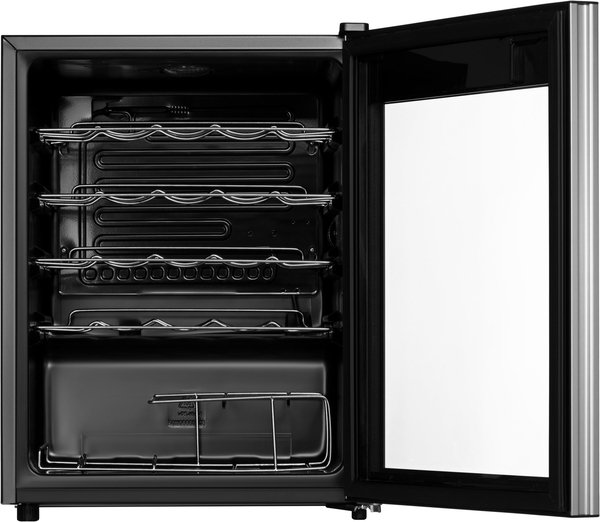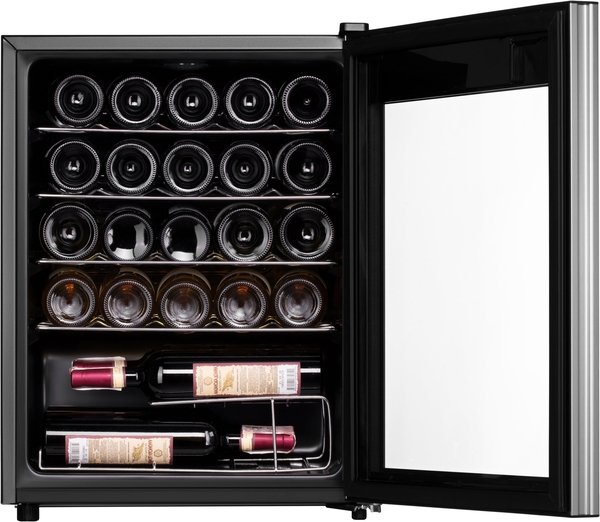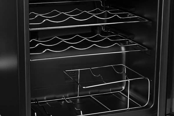 Металевий корпус доповнений скляними дверима з УФ-фільтром і вставками з нержавіючої сталі. Внутрішній простір шафи розраховане на 24 пляшки, а чотири металевих полки доповнені спеціальною стійкою в нижньому відсіку. В якості освітлення використовується LED-підсвітка.