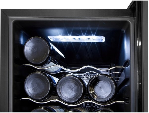 - Винотека має внутрішнє світлодіодне підсвічування та просте сенсорне управління.