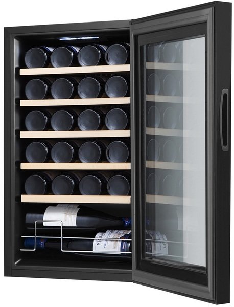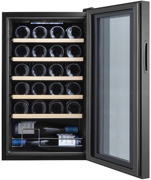 Тоноване дверне скло стійке до подряпин. Вино зберігається в безпеці завдяки холодильному компресору. Датчики автоматично оцінюють поточні умови всередині винотеки й адаптують їх до ваших поточних налаштувань. Двері винотеки герметично закриті, а також є замок від дітей.