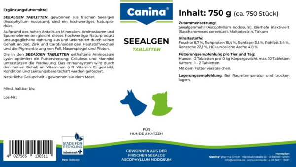 Seealgen - таблетки з морськими водоростями для собак і котів, що сприяють забарвленню шерсті, очей, носа, губ і лап. Містять численні мікроелементи, вітаміни, каротиноїди та мінерали, які отримують свою біологічну ефективність завдяки дбайливому висушуванню свіжих морських водоростей. Морські водорості є важливою підтримкою при дефіциті поживних речовин. Якщо основний корм має сумнівну якість, морські водорості часто демонструють чудовий вплив на продуктивність, здоров'я та енергію тварини.