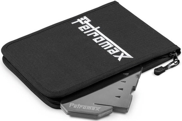 Plug-In Windbreak For Fireplaces — універсальний вітрозахисний екран для мангалів та жарівень від німецького бренду Petromax. Перешкоджає розсіюванню тепла, пришвидшує приготування їжі. Складається у зручний кейс для транспортування завбільшки з журнал. Сегменти з міцної, довговічної сталі надійно тримаються на будь-яких поверхнях завдяки зубчастій формі.