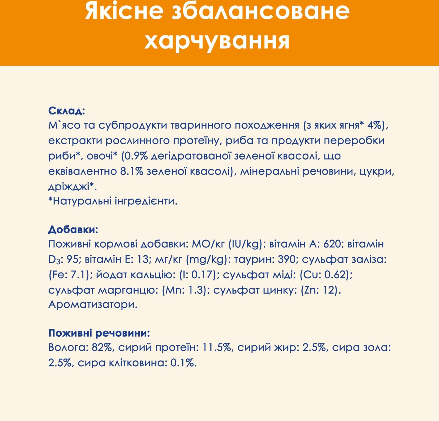 | Склад | М'ясо та субпродукти тваринного походження (з яких ягня 4%), екстракти рослинного протеїну, риба та продукти переробки риби*, овочі* (0.9% дегідратованої зеленої квасолі, що еквівалентно 8.1% зеленої квасолі), мінеральні речовини, цукри, дріжджі |