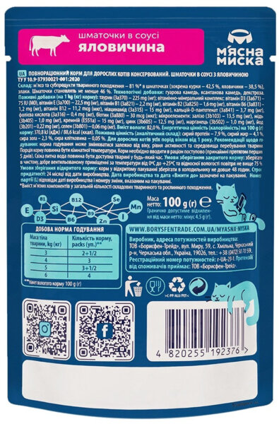 - Вологий корм для котів М'ясна Миска з яловичиною 100 г