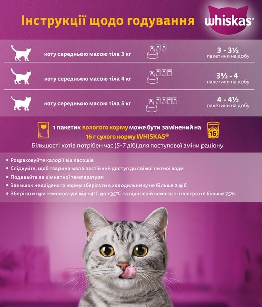 Коту масою тіла 3 kg (кг) необхідно 3 — 3½ пакетика вологого корму на добу, коту масою тіла 4 kg (кг) необхідно 3½ — 4 пакетики вологого корму на добу, коту масою тіла 5 kg (кг) необхідно 4 — 4½ пакетика вологого корму на добу. 1 пакетик вологого корму може бути замінений на 16 g (г) сухого корму WHISKAS. Більшості котів потрібен час (5-7 діб) для поступової зміни раціону. Розраховуйте калорії від ласощів. Корегуйте кількість корму відповідно до потреб вашої кішки. Слідкуйте, щоб тварина мала постійний доступ до свіжої питної води. Подавайте за кімнатної температури; залишок недоїденого корму зберігати в холодильнику не більше 2 діб.
