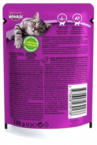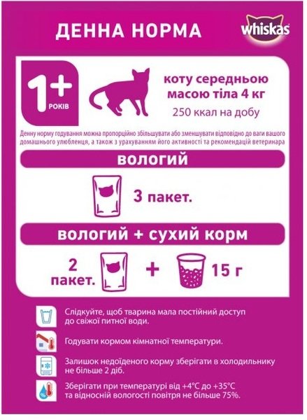 Повнораціонний консервований корм для дорослих котів, віком від 1 року до 7 років. Вибираючи корм для кішок, враховуйте вік, поведінку, а також смакові переваги вашого улюбленця! Вологі раціони Whiskas — це багатий асортимент смаків, різноманітні текстури, натуральні інгредієнти та справжнє задоволення для вашого котика.