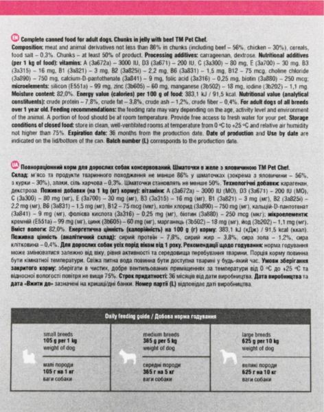 | Склад | М'ясо та продукти тваринного походження не менше 86% у шматочках (у тому числі з яловичини – 56%, курки – 30%), злаки, сіль харчова – 0,3%. Шматочки становлять щонайменше 50% |