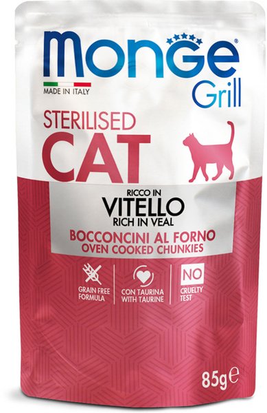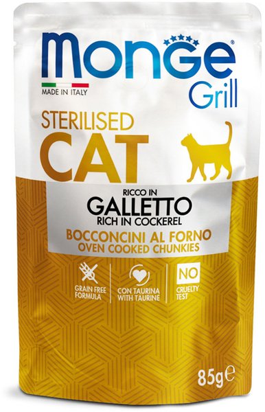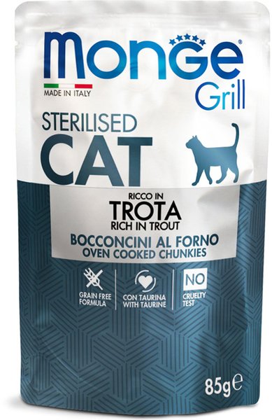 - Упаковка вологого корму для стерилізованих котів Monge Grill з півником, фореллю і телятиною 12*85г