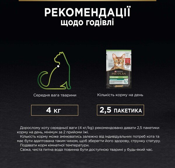 - Дорослій кішці середньої ваги (4 кг) рекомендується давати 3 пакетики корму на день, мінімум за два прийоми їжі.
