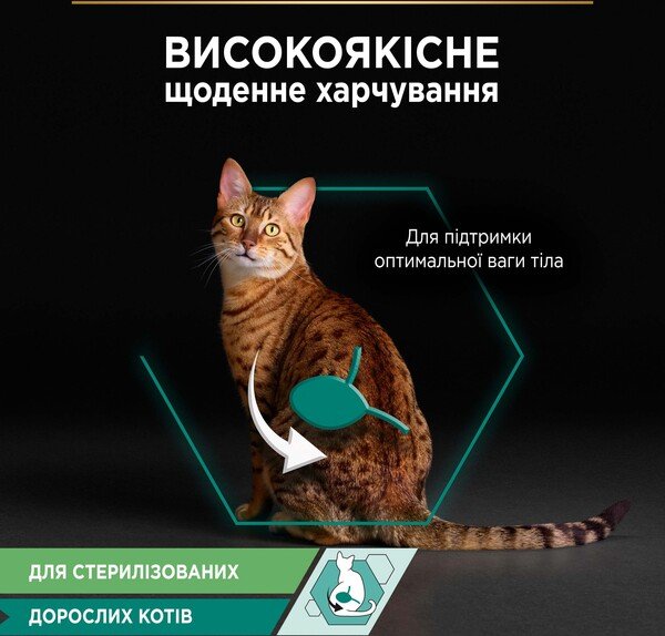 - Спеціальний раціон для стерилізованих кішок і кастрованих котів, відрізняється високим вмістом білків і низьким вмістом жирів. Містить необхідні поживні речовини, вітаміни і мінерали.