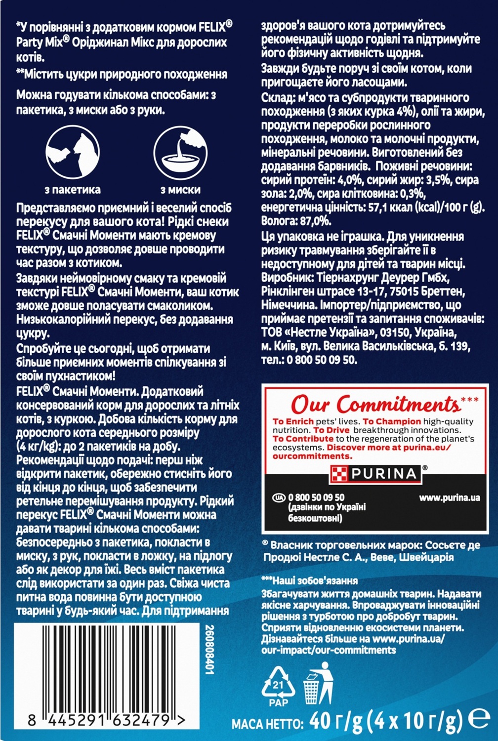Ласощі Felix Deli Moments мають кремову консистенцію, щоб подовжити час із вашою кішкою. Завдяки їх неймовірному смаку та густій м’якій текстурі вашій дитині знадобиться більше часу, щоб їх з’їcти.