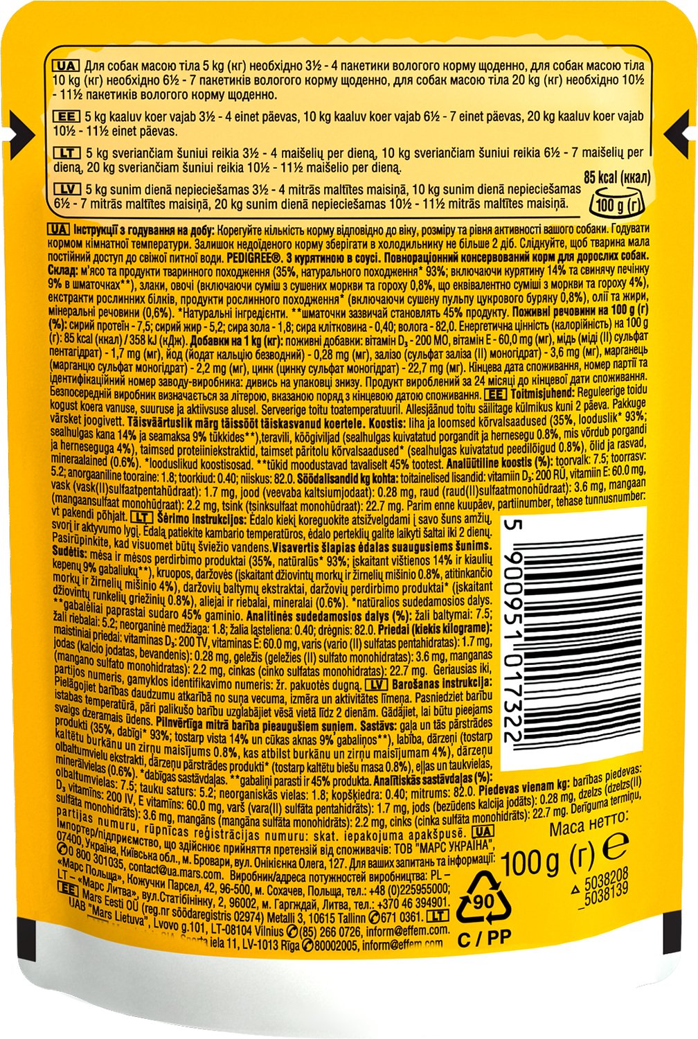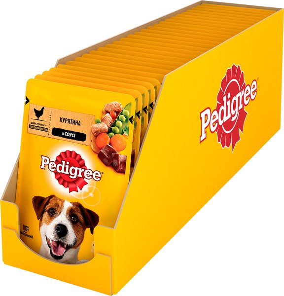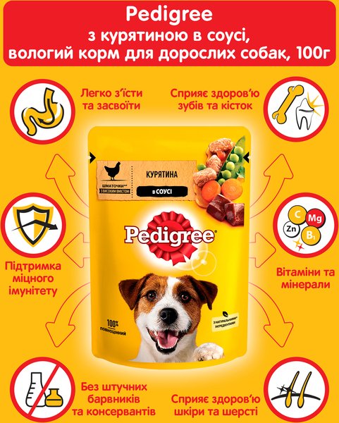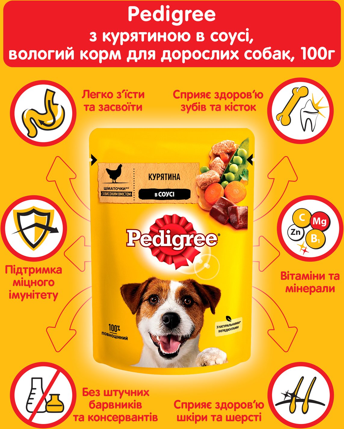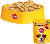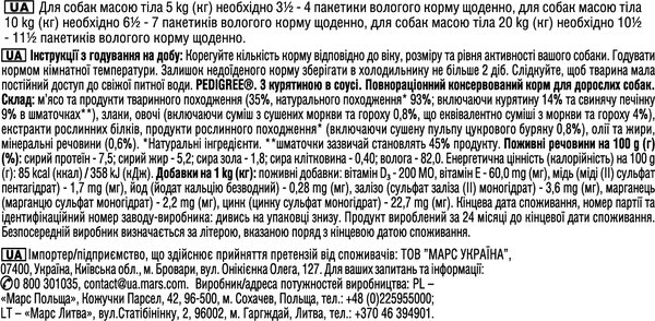 Pedigree - 100% консервований вологий корм для дорослих собак від 1 року, для постійного годування впродовж усього життя. Рекомендується для комбінованого годування з сухим кормом. Без вмісту: штучних барвників, консервантів, ароматизаторів та підсилювачів смаку. Pedigree - це не просто порція соковитих м'ясних шматочків, а й корисний, оптимально збалансований раціон. Він забезпечує організм собаки вітамінами та мінералами, необхідними йому для здорового й активного життя.