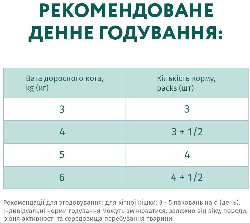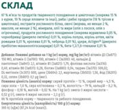 | Харчові добавки | Вітамін Д3 (3a671): 150 МО, вітамін Е (3a700): 100, вітамін C (3a300): 40, кальцію Д пантотенат (3а841): 2,1, вітамін В1 (3а821): 1,79, фолієва кислота 3а316): 0,49, вітамін В6 (3а831): 0,28, біотин (3a880): 0,04, таурин (3a370): 506,02, DL-метіонін (3с301): 600, цинк (3b604): 2,1, марганець (3b503): 1,56, йод (3b201): 0,32, селен (3b801): 0,1 мкг (мкг) |