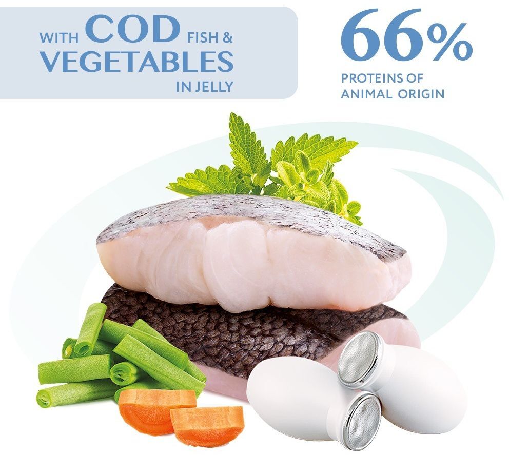 | Склад | 67% м'яса та продуктів тваринного походження в шматочках (у тому числі 15% з курки, 10% серце яловиче та інші), риба та рибні продукти (18% тріски у шматочках), екстракти рослинного білка, овочі (морква, не менше як 2 %), квасоля, не МЕНШЕ 2%), мінерали, олії та жири (олія з лосося, олія з огірка), продукти рослинного походження (зокрема журавлина 0,05%, чорнобривці (джерело лютеїну) 0,01%, корінь лопуха, корінь алтею, квіти ромашки 0,01%, кропива 0 ,01%, чебрець 0,01%), Цукри, Actigen (джерело пребіотик-мананоолігосахариди) 0,01%, бета-1,3/1,6-глюкани 0, 0,1%. |