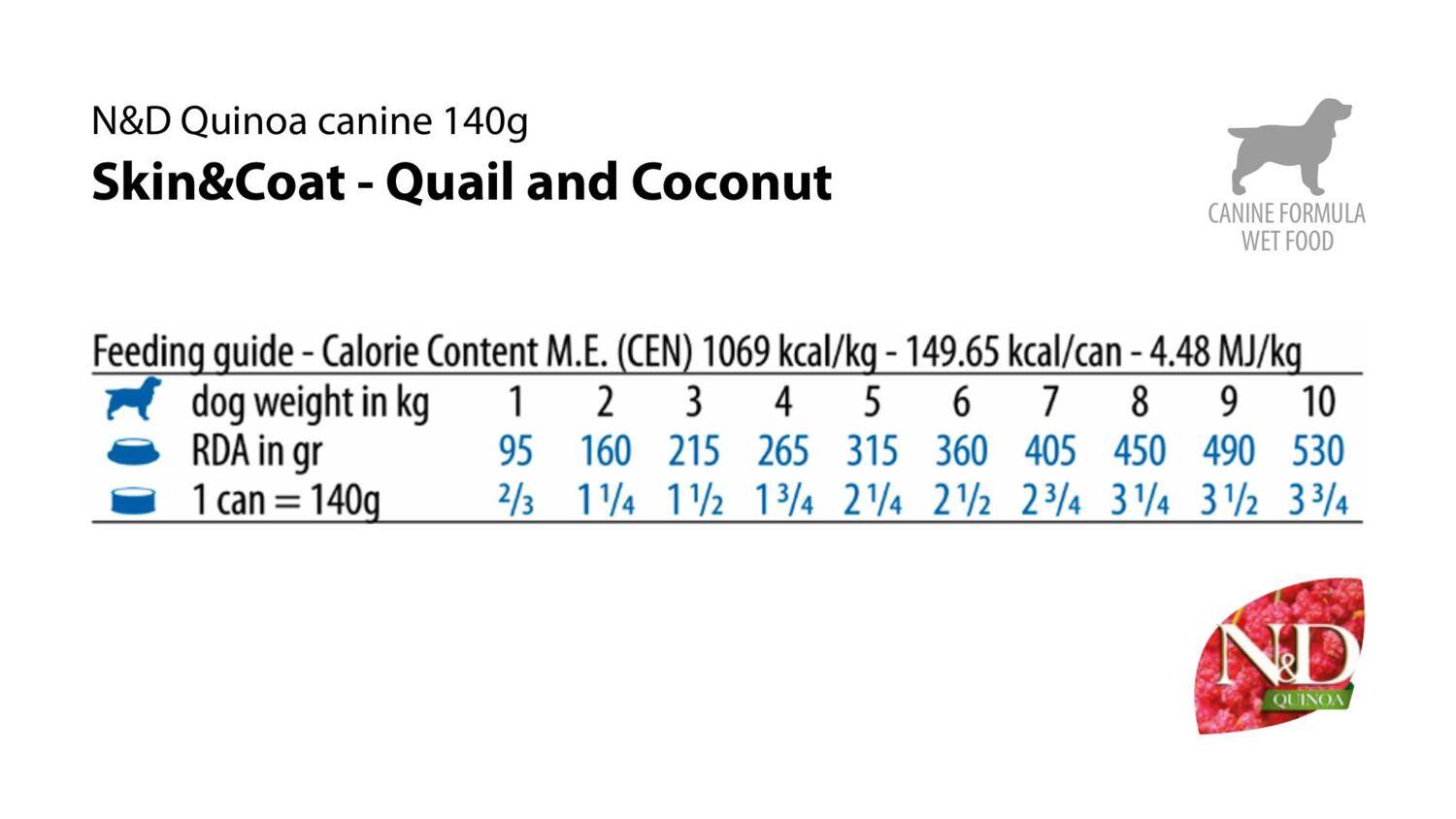 | Склад | Філе перепела (55%), кіноа (5%), риб'ячий жир, кокос (2%), фруктоолігосахариди, холіну хлорид, хондроїтин сульфат, глюкозамін, вітаміни, мінерали. Джерело білка: філе перепела. Джерело вуглеводів: кіноа |