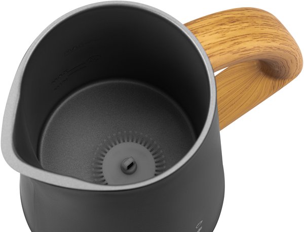 Об’єм резервуара становить 500 мл: для підігрівання молока можна наповнити його по самі вінця або до половини (250 мл) для приготування стійкої, пишної піни. Зручний інтерфейс дає змогу вибрати один із чотирьох режимів: тепла й густа молочна піна, тепла й помірно густа молочна піна, гаряче молоко з невеликою кількістю піни, холодна піна. Після закінчення процесу збивання або після певного періоду бездіяльності спінювач автоматично вимикається для економії енергії та безпеки.