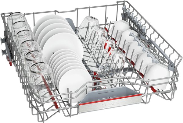 Місткий верхній короб можна регулювати за висотою в цілому на 5 см між трьома положеннями простим рухом руки – завдяки системі RackMatic. Тарілки для піци чи фужери на високій ніжці — ця система дозволяє дуже гнучко створити додаткове місце для високих предметів посуду у верхньому або нижньому коробі.