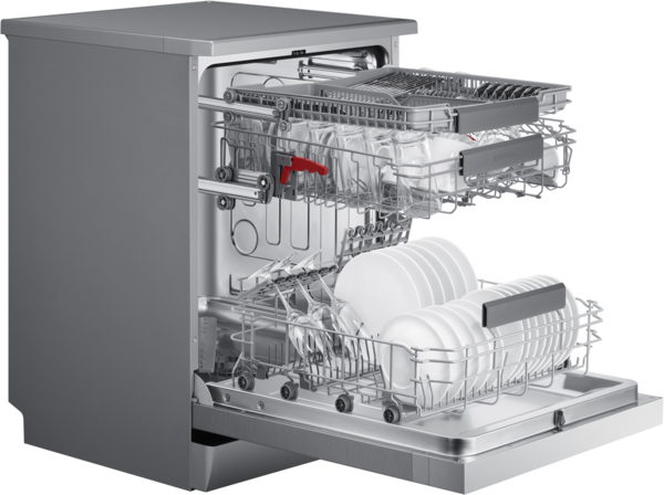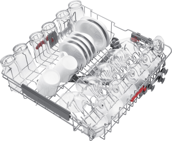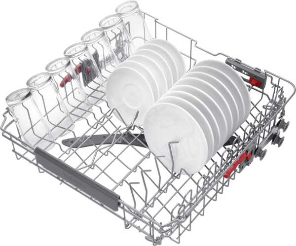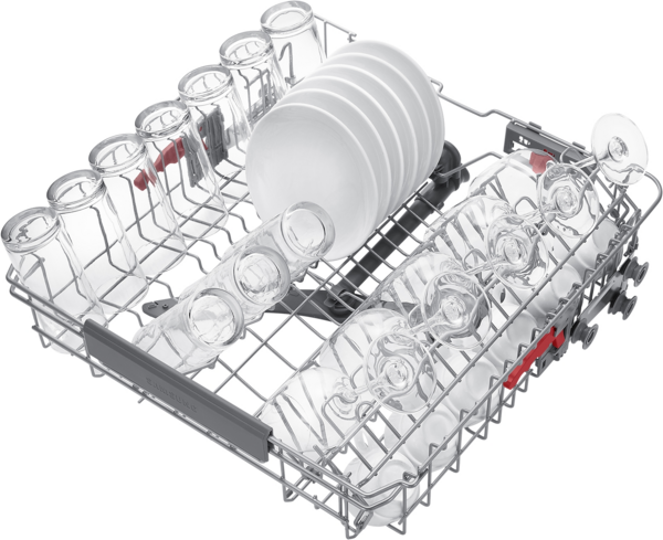Поміщайте різноманітний посуд, склянки й чашки легше та безпечніше. Кут зубців у середньому кошику можна регулювати в 3 положеннях за допомогою важеля позаду. Зубці нижнього кошика також складаються, щоб помістити великий посуд. А підставка для склянок безпечно утримує делікатні предмети.