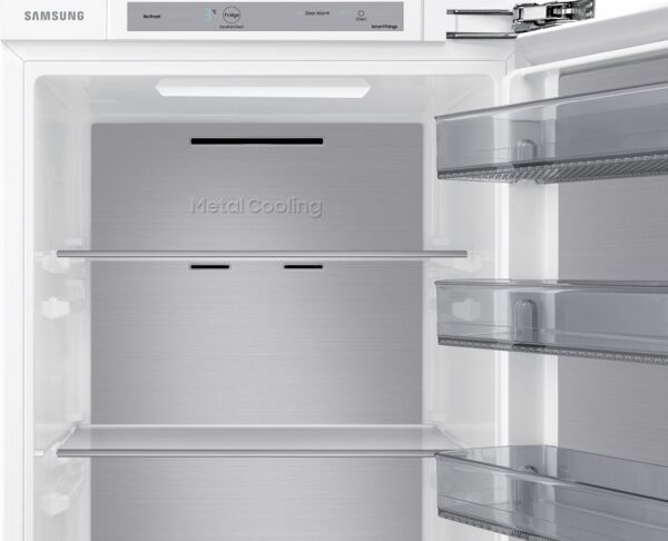 Заощаджуйте час, сили та енергію на зберіганні продуктів. Просто відстежуйте та керуйте роботою холодильника в будь-який час та в будь-якому місці за допомогою програми SmartThings App. Він включає режим AI Energy Mode, який дозволяє контролювати та зменшувати споживання енергії до 10%. А система охолодження Metal Cooling швидко відновлює втрати тепла.