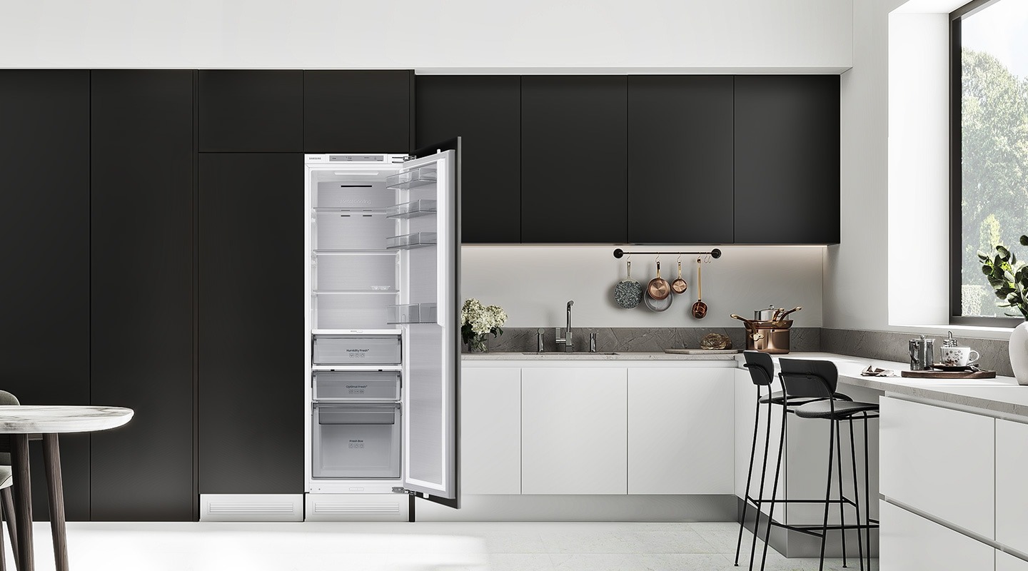 Підтримуйте оптимальну температуру всередині холодильника, щоб продукти залишалися свіжими, навіть якщо ви часто відчиняєте дверцята. Металеві дверцята та металева охолоджувальна пластина утримують холод з повітря та швидко відновлюють втрачене тепло. А разом з металевим оздобленням полиць вони мають преміальний вигляд та легко миються.