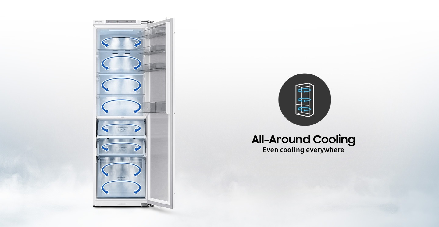 Переконайтеся, що всі ваші продукти належним чином охолоджені. Система всебічного охолодження рівномірно охолоджує кожне відділення від кута до кута. Вона постійно перевіряє температуру та циркулює прохолодне повітря через стратегічно розміщені вентиляційні отвори. Таким чином, продукти зберігаються при оптимальній температурі й довше залишаються свіжими.