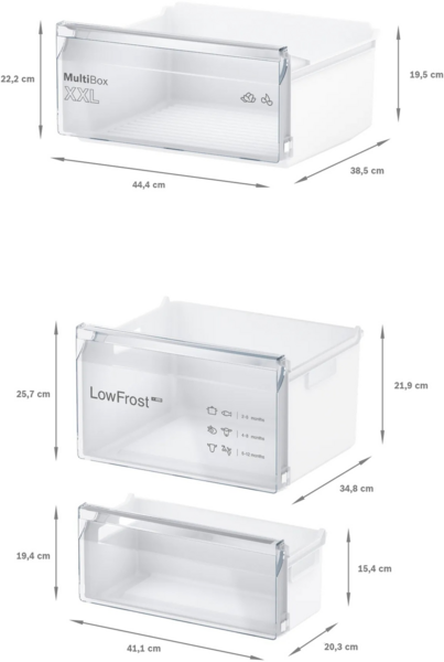 У морозильній камері, крім стандартних контейнерів, Ви знайдете просторий контейнер BigBox висотою 29 см, в який без зусиль помістяться "великогабаритні" продукти. Наприклад, індичка до 8 кг.