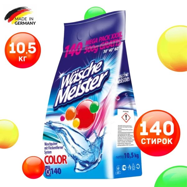 Він має свіжий аромат, і прочень добре розчиняється навіть у холодній воді, містить дуже багато синіх гранул. Не викликає алергії і не подразнює шкіру. Стиральный порошок Wasche Meister не содержит фосфатов. Это мощный и очень эффективный стиральный порошок. Его можно использовать во всех типах стиральных машин, а также для ручной стирки. Применяется в температурном режиме от 30°С до 90°С. Благодаря особым компонентам, он не только справляется с задачей удалить пятна, но и заботится о сохранении цвета ваших любимых вещей.
