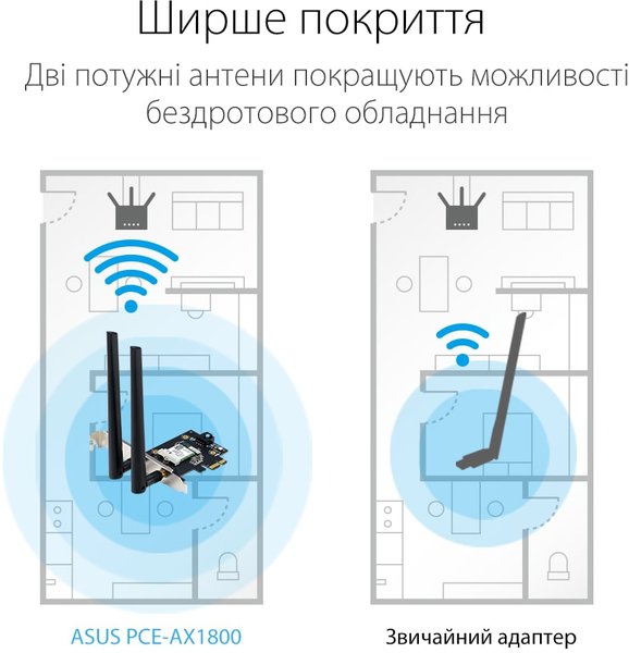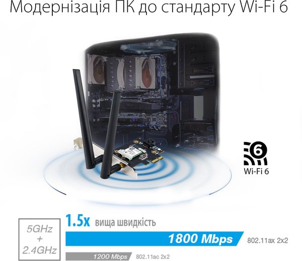 Відгуки та питання про WiFi-адаптер ASUS PCE-AX1800 Bluetooth 5.2 PCI Express WPA3 MU-MIMO OFDMA