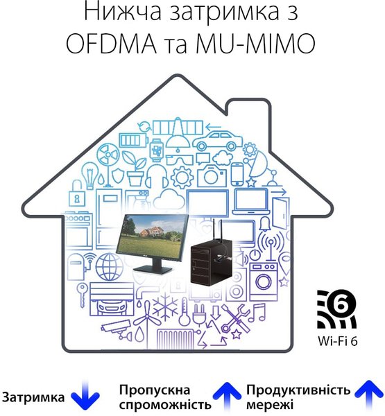 - Технології OFDMA та MU-MIMO WiFi 6 забезпечують ефективну, стабільну та швидку передачу даних, навіть якщо дані передають кілька пристроїв одночасно.