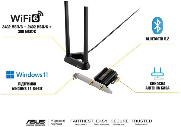 ASUS пропонує комплексне рішення для розгортання мережі нового стандарту WiFi 6E, до складу якого входять маршрутизатори та бездротові адаптери з інтерфейсом PCIe. Завдяки ретельно розробленому апаратному та програмному забезпеченню рішення ASUS Wi-Fi 6E забезпечує високу продуктивність та широкі функціональні можливості. Адаптер PCE-AXE59BT підтримує лише стандарт PCI Express x1, тому його слід установлювати у слот PCIe x1.