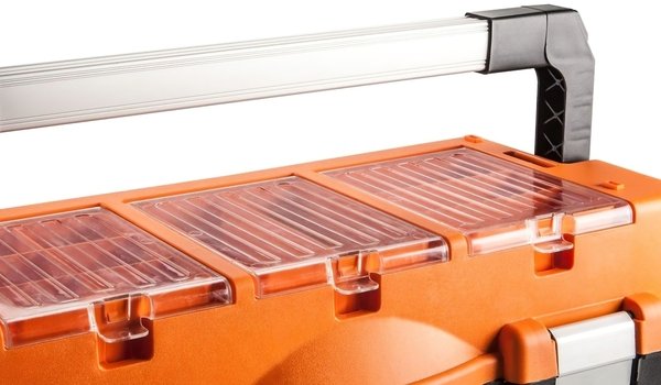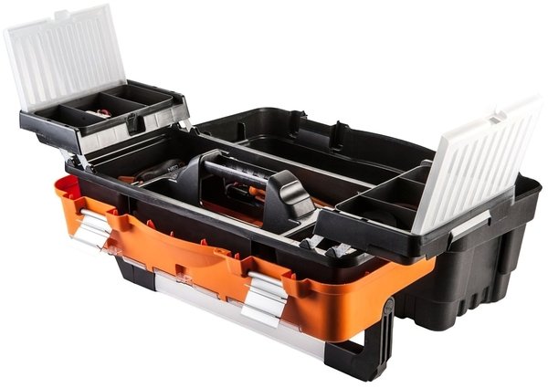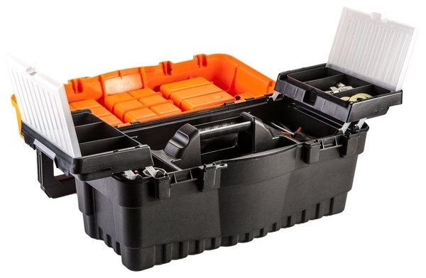 Ящик для інструменту NEO 20" придатний для широкого спектра використання. Ящик виготовлений з високоміцних пластмас методом інжекційного формування, що гарантує точність підгонки деталей. Має всередині піддон для інструменту. Ящик закривається за допомогою металевих замків. Вага виробу 1605 г, а допустиме навантаження до 30 кг.
