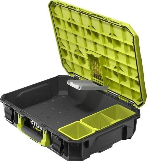 Цей ящик для інструментів має клас захисту IP65, що захищає ваші інструменти від води та пилу в будь-якому середовищі. Вбудований відсік для зберігання насадок Ryobi, подвійний і одинарний контейнери-органайзери забезпечують максимальну організацію та легко закріплюють ваші речі за допомогою замка.